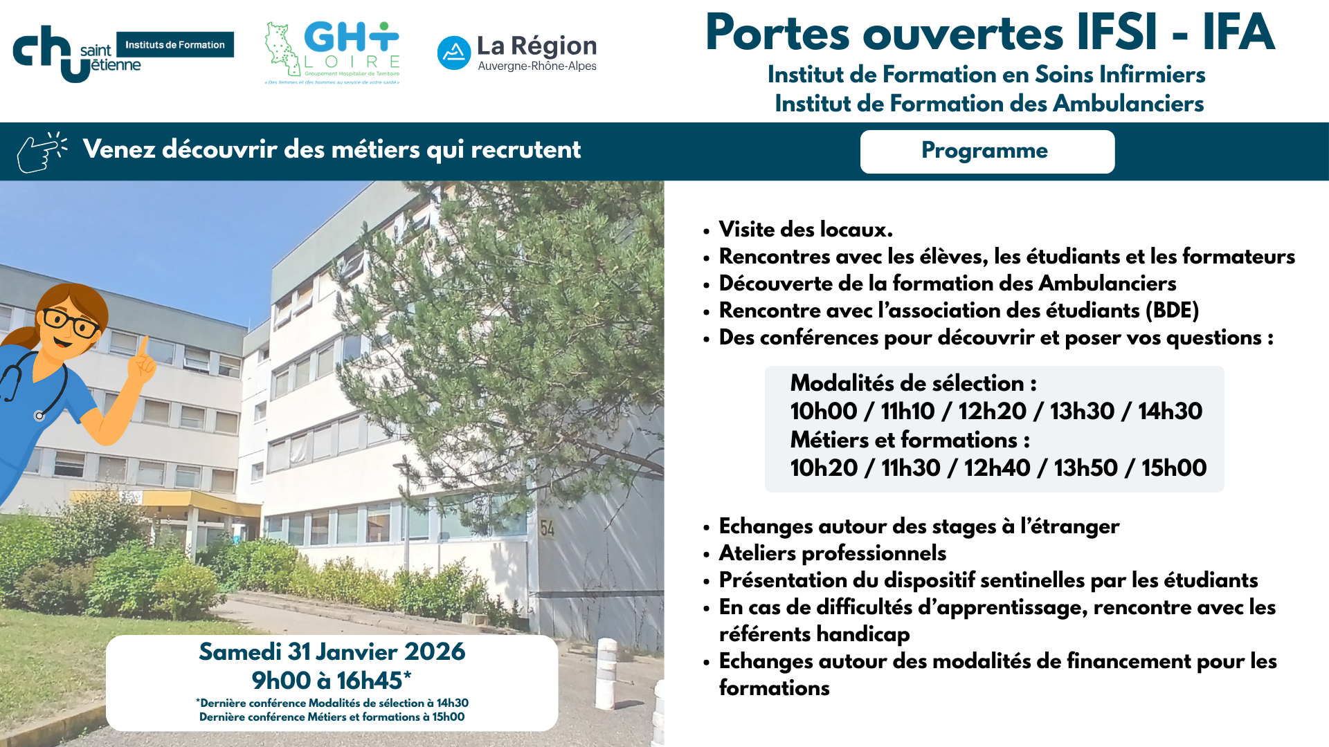 Les instituts de formation du CHU de Saint-Etienne sont composés d’un Institut de Formation en Soins Infirmiers (IFSI), d’un institut de formation des ambulanciers (IFA) et d’un Institut de Formation des Cadres de Santé (IFCS).